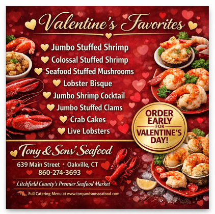Customers continue to rely on Tony & Sons’ Seafood for signature offerings such as jumbo stuffed shrimp, hand-picked Naked Lobster Meat, Tony’s Famous Shrimp Cocktail, all-natural scallops, New England shellfish, and a wide variety of seasonal specialties that have become traditions throughout Connecticut.